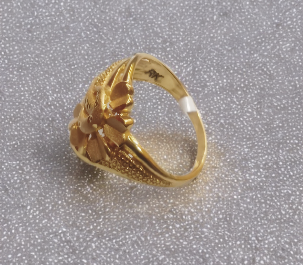 This beautifully crafted gold-plated floral horseshoe ring combines elegance with symbolic meaning. Designed with a detailed flower motif and a delicate horseshoe centerpiece, this ring represents good luck, positivity, and timeless beauty. Its polished finish and intricate texture make it perfect for festive wear, traditional outfits, casual styling, or gifting on birthdays, anniversaries, and special occasions.